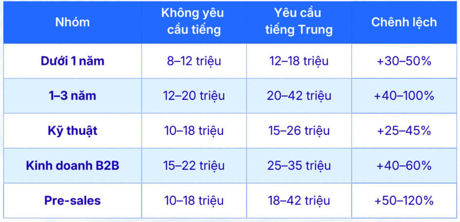 Mức lương của ứng viên yêu cầu tiếng Trung và không yêu cầu ngoại ngữ 2025.