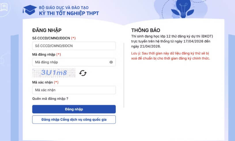 Thí sinh lớp 12 năm học 2025-2026 đăng ký trực tuyến bằng tài khoản và mật khẩu do nhà trường cấp. Thí sinh tự do đăng ký trực tuyến bằng tài khoản VNeID qua Cổng dịch vụ công quốc gia.